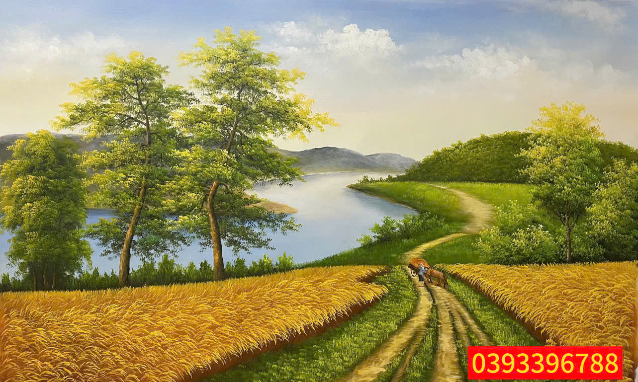 Tranh đồng quê mở ra một không gian làng quê êm đềm, nơi nhịp sống trôi chậm theo tiếng gió và mùi hương lúa chín. Trên nền trời trong veo là cánh đồng trải dài bất tận, sắc xanh – vàng đan xen mềm mại. Con sông nhỏ lặng lờ ôm lấy xóm làng, phản chiếu hàng tre nghiêng bóng, mái nhà tranh đơn sơ ẩn hiện sau tán lá.