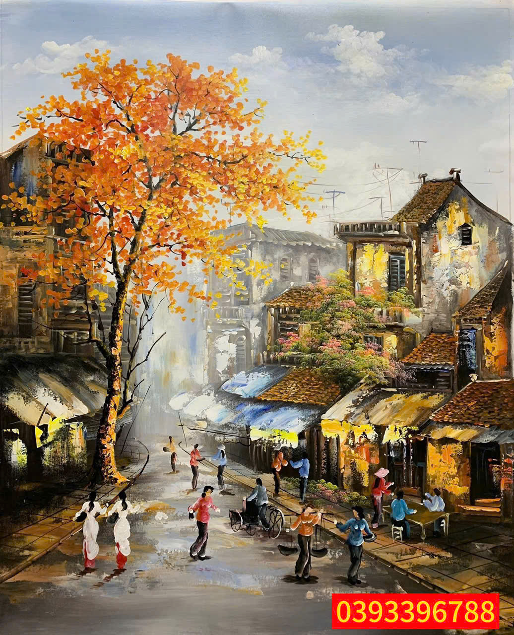 Tranh phố cổ mang vẻ đẹp trầm mặc, bình yên với những mái ngói rêu phong, con đường gạch nhỏ, ánh đèn vàng hoài niệm cùng nét sinh hoạt thanh bình của người xưa. Màu sắc cổ điển pha chất lãng mạn giúp người xem như được trở về ký ức Hà Nội xưa — nơi có nhịp sống chậm, tinh tế và đầy chất thơ. Bức tranh phù hợp treo phòng khách, phòng làm việc, sảnh tiếp khách, nhà hàng, quán cà phê, homestay, showroom nghệ thuật giúp không gian thêm sang trọng, ấm cúng và đậm dấu ấn văn hoá Việt.