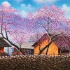 Mỗi độ xuân về, khi mây trắng còn vờn quanh những đỉnh núi cao, Tây Bắc lại bừng lên sức sống mới trong sắc hồng tươi thắm của hoa đào. Trên các sườn đồi thoai thoải, trước hiên nhà sàn, trong vườn nhỏ ven suối, những cành đào rực rỡ như những đốm lửa hồng sưởi ấm cả không gian se lạnh. Trong tranh, màu hồng phơn phớt của hoa hòa cùng màu xanh non của lá, màu nâu trầm của vách gỗ và mái ngói phủ rêu, tạo nên bức họa thiên nhiên thật dung dị mà quyến rũ.