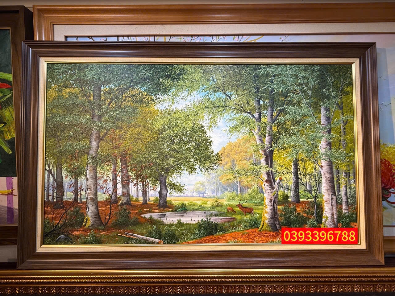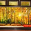 Bức tranh phong cảnh rừng cây mùa thu mang ý nghĩa bình yên, thư thái và hòa hợp với thiên nhiên. Hình ảnh cây cối, hồ nước và đàn hươu tượng trưng cho tài lộc, may mắn và thịnh vượng, giúp không gian thêm ấm áp, sang trọng và an lành.